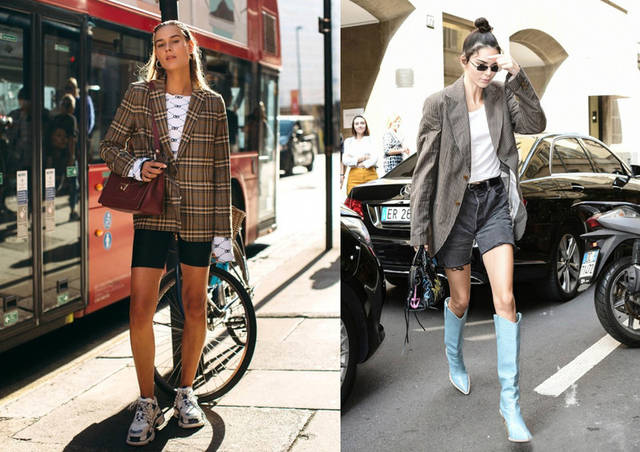 ♦日常出街的选搭,简单的骑行裤还有就是和格纹西装组合,深黄格纹西装+白色内搭+黑色骑行裤,选搭运动鞋休闲舒适的穿搭。灰色西装选搭白色T恤和深灰骑行裤(牛仔款),靴子的颜色可以尝试选择淡彩色。