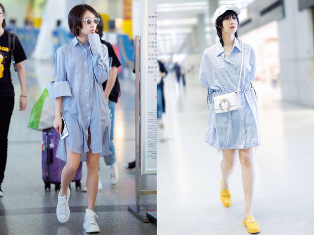 除了纯白色衬衫裙,蓝条纹款式的衬衫裙也是经典好搭,明星们超喜欢这种衬衫裙,像周冬雨和宋茜都喜欢穿,周冬雨将蓝色条纹衬衫裙配小白鞋穿,简约耐看。宋茜是配黄色鞋穿,看起来更文艺亮眼。
