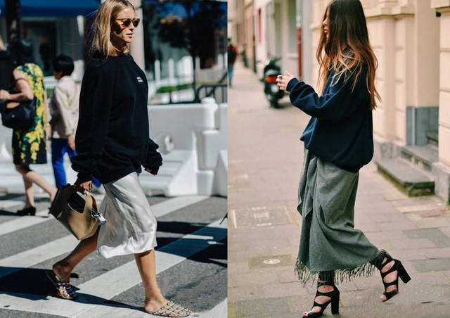 ♦日常简单的造型选搭,黑色卫衣和半裙搭配,半裙的款式选择,简单的灰色缎面或者是深灰薄款针织裙,整体色调的搭配,黑色宽松卫衣+灰色裙装,黑色的高跟鞋组合,休闲气质的穿搭,包包颜色推荐选择淡彩色。