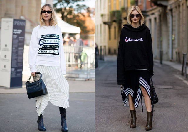 ♦卫衣的穿搭,简单的款式组合,白色简约字母卫衣选搭白色条纹半裙,包包和短靴选择黑色款。整体黑色的穿搭,黑色的裙摆条纹款选搭,包包和高跟短靴简约穿搭选择黑色调,简单的穿搭选择白色包包组合。