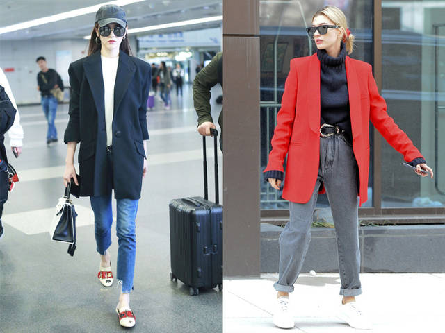 第一种穿法是西装配牛仔裤,这种穿法相信很多女生都不陌生,干练的西装加上中性风的牛仔裤,通勤又帅气。像大表姐刘雯用格纹西装搭配简单的九分牛仔裤,整体看起来通勤摩登。金宥真用黑色西装搭配蓝色印花牛仔裤也很不错,通勤耐看。