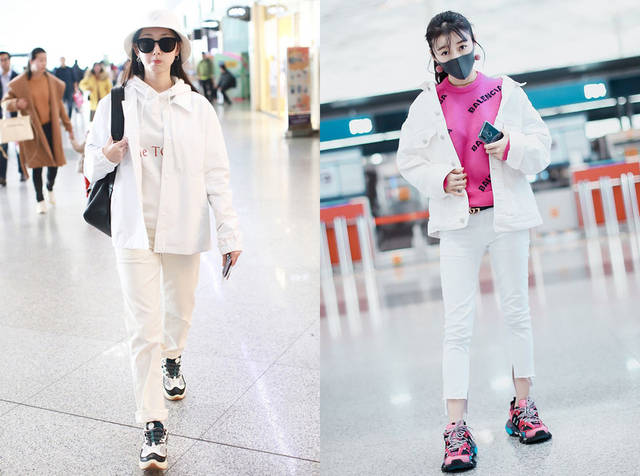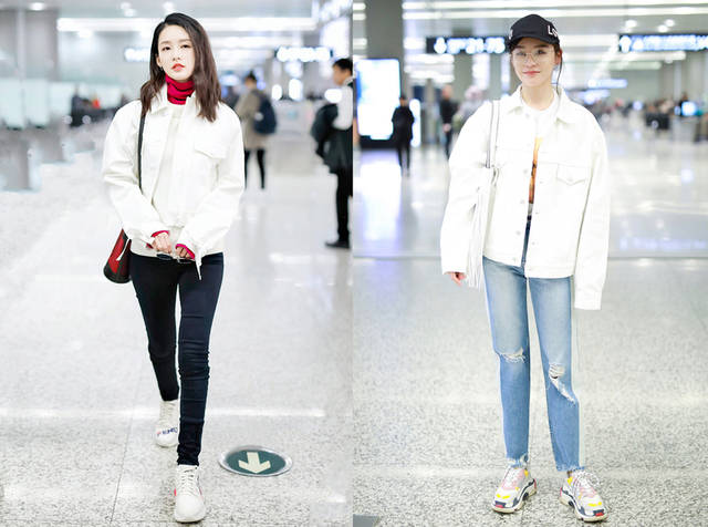 李沁和袁姗都不约而同的选择了白色牛仔外套,李沁用白色牛仔外套叠加红白毛衣,造型非常清新活力,下身选择基础的黑色款,减龄又很耐看。袁姗姗是白色牛仔外套配印花T恤和破洞牛仔裤,看起来帅气无比。