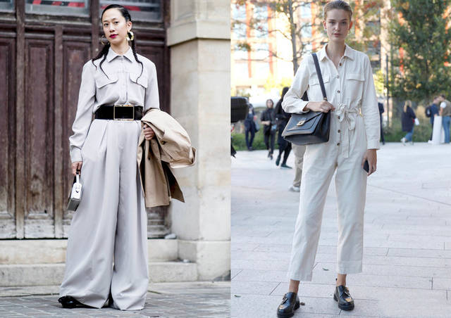 ♦越是简单的款式越是要注意细节的变化,灰色宽松的款式选搭时,简单的黑色款腰带帮你塑型。在搭配上灰白款,选择黑色调的包包和鞋子是日常简单穿搭,主要是款式上,连体工装裤和商务类型的包包是不错的组合。