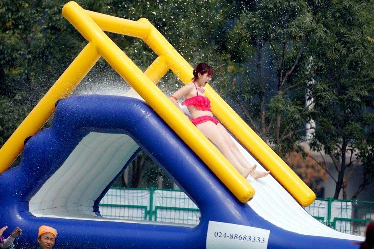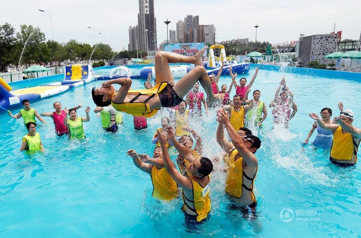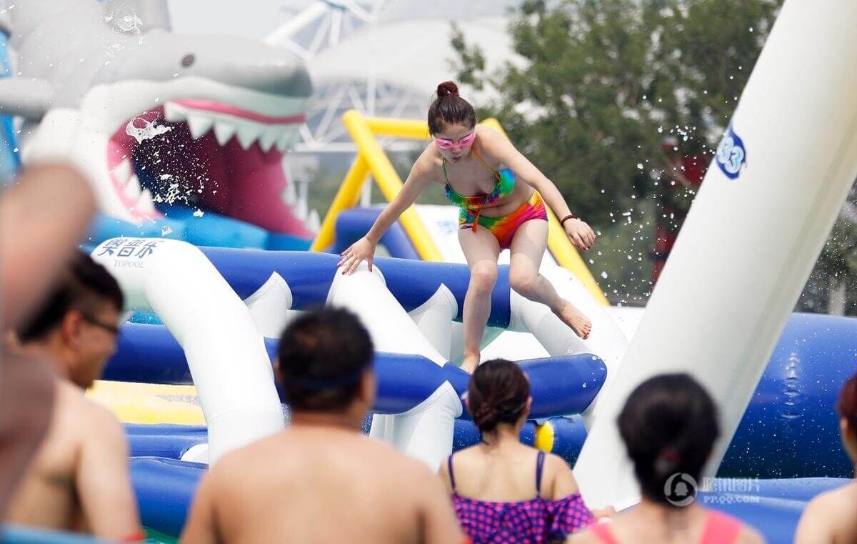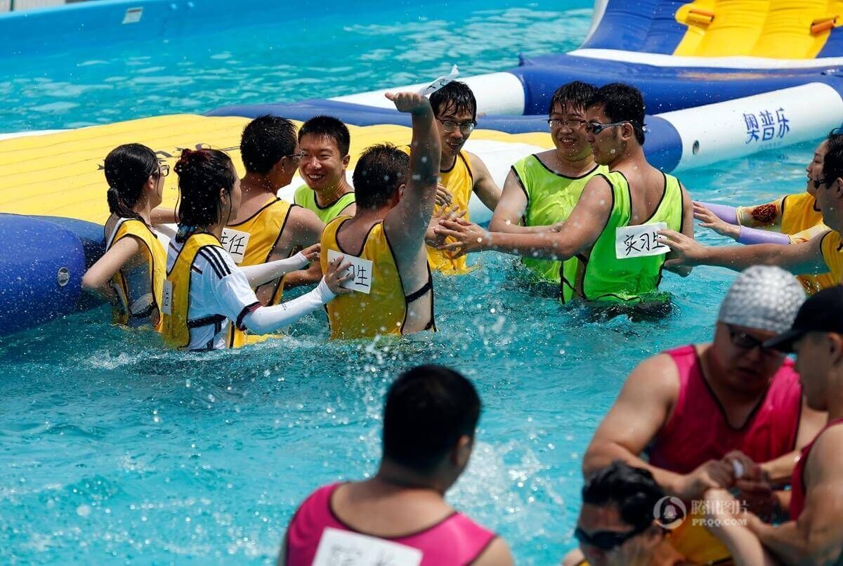 近日,在沈阳奥体中心附近一水上欢乐世界,为了缓解医护人员职业精神压力丰富他们的业余生活,举办了“撕名牌”大闯关等活动,前来参加的队伍都是来自各个医院的医生护士等。图为医生和护士身穿比基尼在炎炎夏日里进行比赛,场面火爆,气氛热烈。