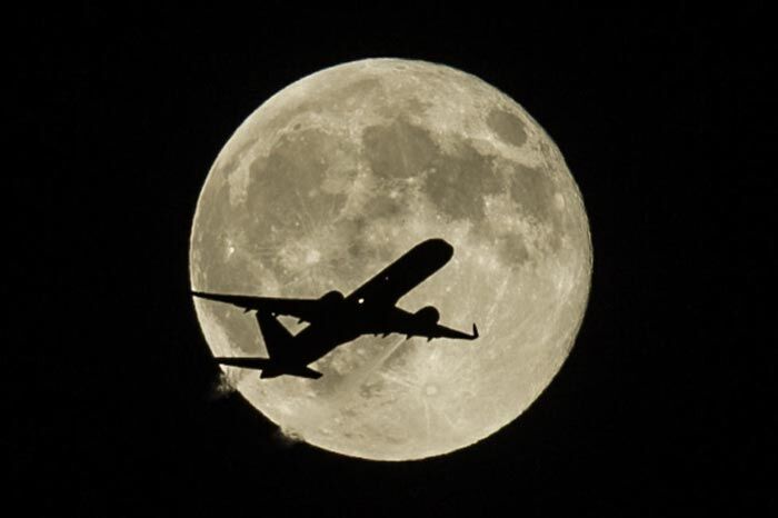 当地时间2015年8月29日,美国洛杉矶,一架西捷航空客机从一轮超级月亮前飞过。