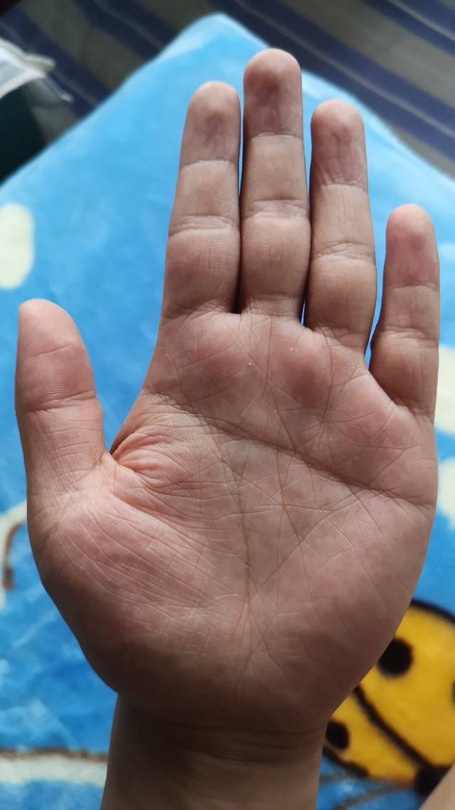 【手相分析】日主手掌颜色正常比较透红,手掌肉厚不露骨,呈现偏正长方形态,五指较为粗细正常,齐整没有缺失,但五指并拢时不紧紧相合,拇指和小指较短一些。
