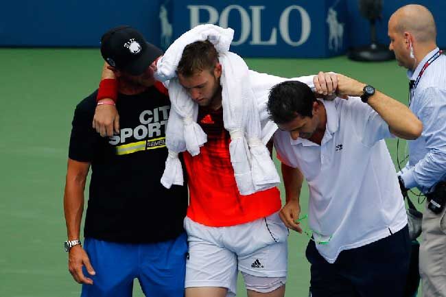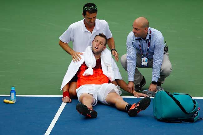 北京时间9月4日,2015年美网男单第二轮较量中,28号种子、美国名将索科在大比分4-6/4-6/6-3/2-1落后比利时选手贝梅尔曼斯时,因为暴晒过久导致抽筋眩晕无奈遗憾退赛。