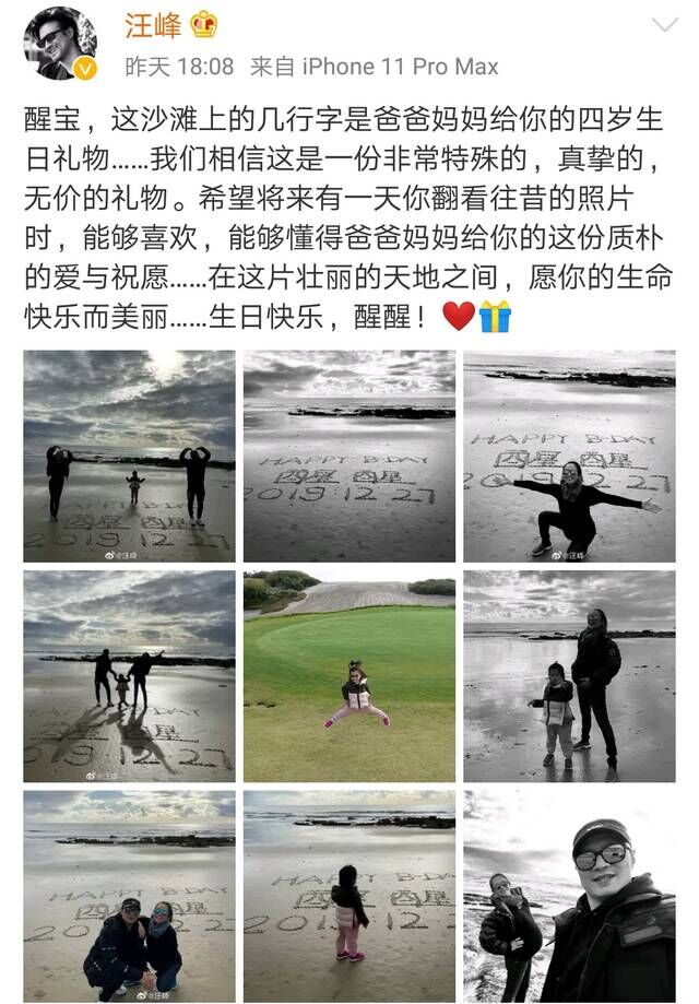 近日,汪峰在微博上晒出海滩全家福为醒醒庆生,并配文:“醒宝,这沙滩上的几行字是爸爸妈妈给你的四岁生日礼物……我们相信这是一份非常特殊的,真挚的,无价的礼物。希望将来有一天你翻看往昔的照片时,能够喜欢,能够懂得爸爸妈妈给你的这份质朴的爱与祝愿……在这片壮丽的天地之间,愿你的生命快乐而美丽……生日快乐,醒醒!”照片中,章子怡挺着大大的孕肚与汪峰和女儿醒醒同框合影,身材和状态依旧很棒,醒醒站在汪峰、章子怡之间,和爸爸妈妈手拉手,画面超温馨有爱呢!汪峰章子怡海边为女儿醒醒庆生,章子怡穿紧身上衣孕肚大如球,四肢纤细让人羡慕不已!