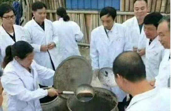 还有一张照片显示着一群穿着白大褂的医生,围着一个大铁罐,里面或许装的就是那“长生液”吧......