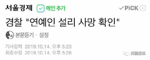 根据韩媒新闻,崔雪莉于今日下午韩国时间3点21分(即中国时间2点21分)左右,在韩国某公寓内,被发现自杀身亡。