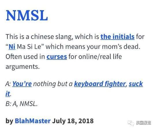 “nmsl:中文俚语,ni ma si le的首字母,意为你妈妈去世了。常用于网络和日常撕x的咒骂中。“