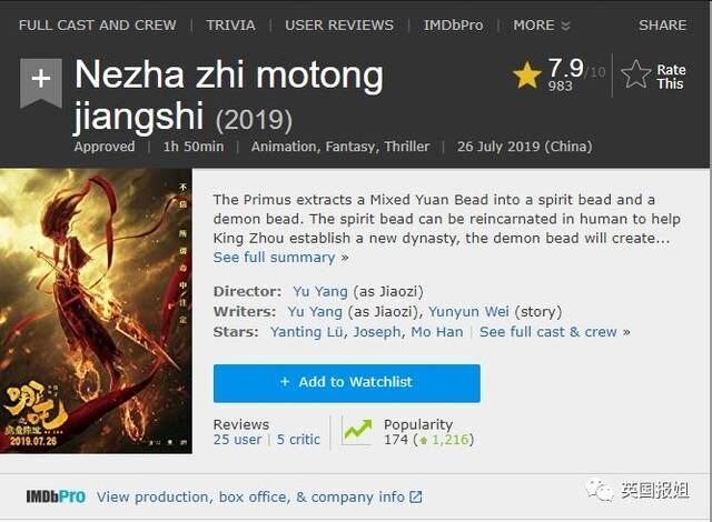 8月29日,哪吒IMAX版在北美上映,在IMDb也有7.9分的好成绩。