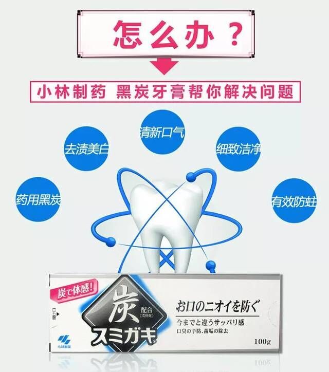 小林制药的美白牙膏添加了炭颗粒,在清洁牙齿的同时,去除附着在牙齿上的黄斑。
