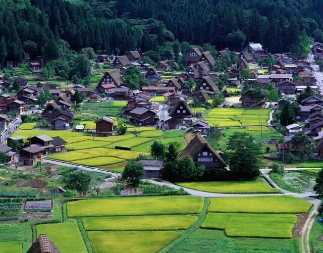 白川乡以合掌造型的房屋而闻名,这种有着400余年历史的房屋建造时不使用一颗钉子,屋顶倾斜约60度,有效的避免积雪对房顶的压力,1995年被联合国教科文组织定为世界文化遗产。
