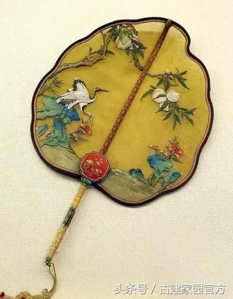 比如富察皇后使用的那把上绣桃树、仙鹤,以明黄做基调的团扇便是仿自清代“黄色纱贴绫绢桃树双鹤图染雕骨柄团扇”;