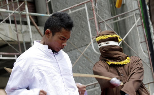 当地时间2015年9月18日,印尼亚齐省,一名妇女因为未婚性行为公开接受鞭刑。亚齐省是印尼唯一一个实施伊斯兰教法的省份。
