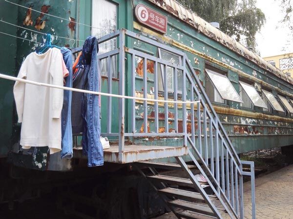 一些学生把洗完的衣服、床单晾晒在车厢外。