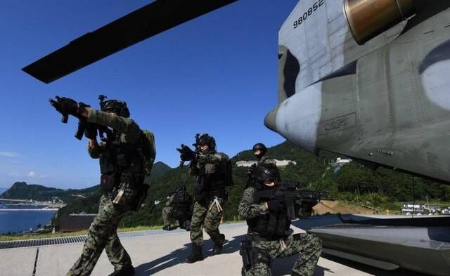 不过,没有战争并不代表着不会出现一些“必要”的军事行动。就在本月的25日,伴随着黑鹰直升机的喧闹声,韩方海军特战队现身独岛地界,并且完全是采取战术形态进行行动,宛如战斗即将开始一样。当然,其实这次的韩方海军特战队降临独岛,并不是一次“具有针对性”的军事行动,而是“惯例”,即进行独岛的防御军事演习。不过,这次的军事演习,却和往年的演习“稍微”有一些不同。