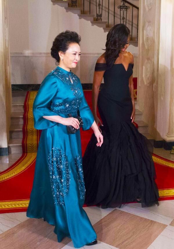 在彭丽媛身旁的米歇尔,穿着的则是由华裔设计师王薇薇(VeraWang)设计的一套非常经典的西式礼服。