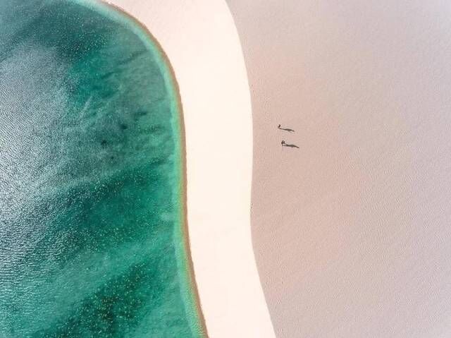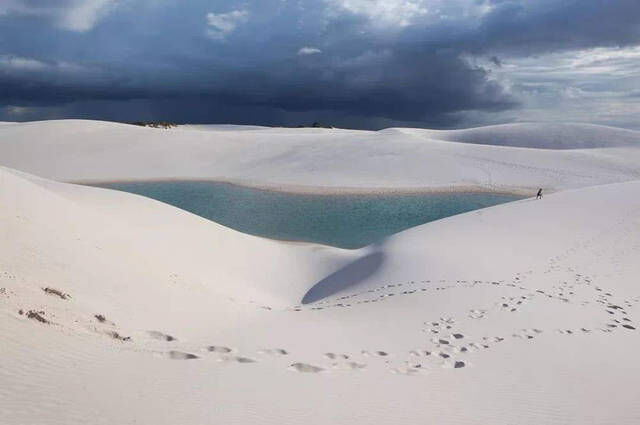 这里是拉克伊斯沙漠,其位于巴西的马拉尼奥州境内,和平日里见到的沙漠不同的是,这里有很多深蓝色的水源,在白色沙丘的承托之下看起来非常的漂亮,若是没有人体型这里是沙漠,人们几乎就将其当做是湖泊了。它看起来是那么的迷人,河流呈现出绚丽的色彩,仿佛是一道被编织的彩带,缓缓流进人们的心灵深处。