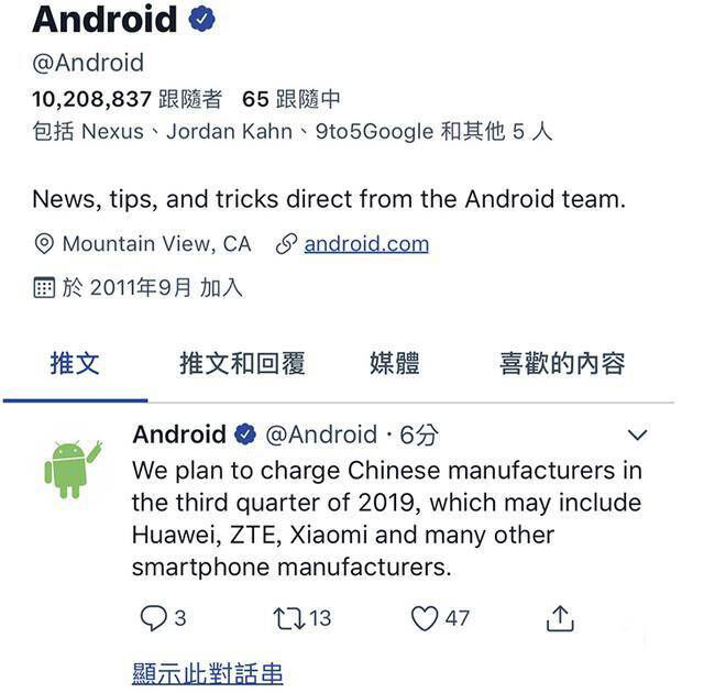 事件的起因是谷歌安卓官方推特发文称,将在2019年第三季度,对包括华为中兴小米等智能手机厂商收费。
