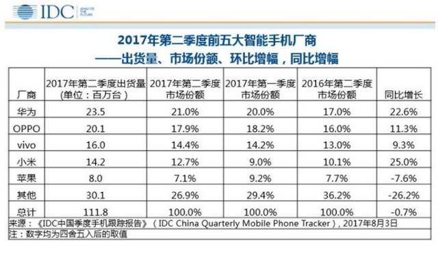 在IDC日前发布的中国季度手机跟踪报告中,华为、OPPO、vivo、小米、苹果等排名前五的手机品牌在今年第二季度拿走了超过70%的市场份额,留给“其他”一栏的仅剩26.9%,而这个数字在上个季度还是29.4%,去年第二季度的时候占比达到36.2%。