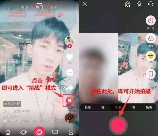 在最新的版本更新中,音乐短视频领跑者奶糖推出了名为“Battle”的新玩法,如果你对其他人所录制的短视频感兴趣,可以通过APP上的“B”按钮发起“挑战”,最后可以合成一个双屏内容的短视频。