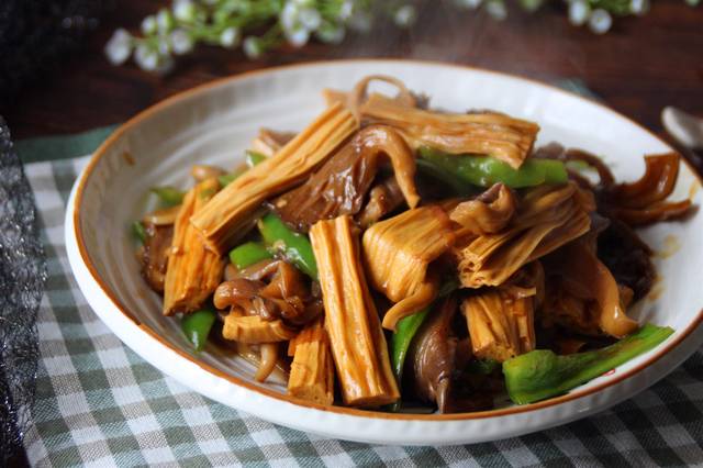 【腐竹烧平菇】材料:腐竹(干)150克、平菇250克、尖椒1个、油盐适量、葱1段、姜1片、大蒜2瓣、生抽1汤匙、白糖1茶匙、水淀粉适量。