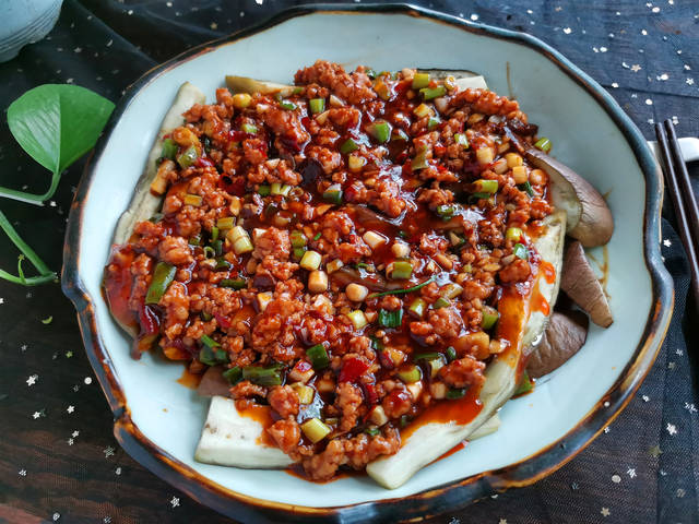 【浇汁肉末茄子】所需材料:茄子500克、猪肉100克、油盐适量、小葱2棵、姜1片、大蒜2瓣、料酒半汤匙、郫县豆瓣酱1汤匙、生抽1汤匙、白糖少许、水淀粉适量、