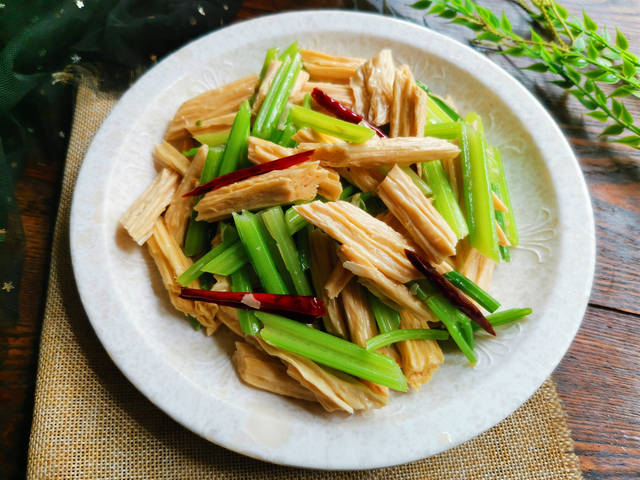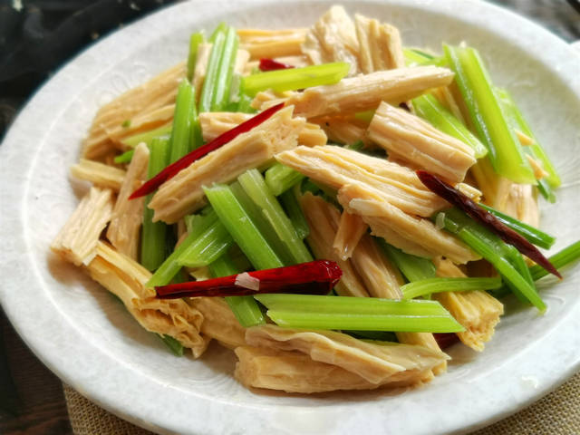 芹菜和腐竹搭配是我们日常生活中最为常见的做法了,比如说有芹菜拌腐竹、芹菜腐竹木耳等,芹菜口感脆嫩,清香,具有利尿消肿,养血补虚,清热解毒之功效。腐竹口感韧柔,豆香浓郁,具有健脑,保护心脏,降低血液中胆固醇含量等功效。用芹菜与腐竹搭配同炒,味道鲜美,清香爽口,营养丰富。芹菜炒腐竹还有降压补益脾胃的好处,是夏季百吃不厌的一道家常小炒,下面介绍芹菜炒腐竹的家常做法。