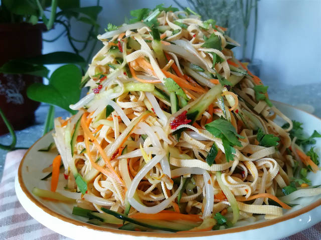 【东北家常凉拌菜】材料:黄瓜2根、绿豆芽250克、胡萝卜1根、干豆腐3张、香菜1棵、辣椒油1汤匙、香油1汤匙、盐适量、大蒜3瓣、白糖1汤匙、米醋2汤匙、生抽1汤匙、