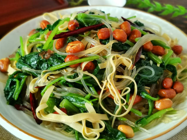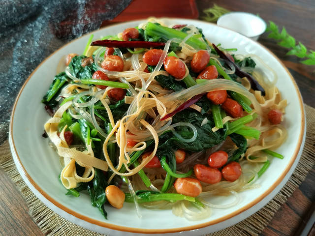 菠菜有“营养模范生”之称,它富含类胡萝卜素、维生素、矿物质等,是大家喜爱的蔬菜,菠菜中所含的胡萝卜素,在人体内转变成维生素A,能维护正常视力和上皮细胞的健康,增加预防传染病的能力,促进儿童生长发育。夏季的菠菜怎样做好吃?夏季,就喜欢这样吃菠菜,切一切,焯下水,拌一拌,味道鲜嫩味美,还可以和很多食材搭配,今天分享的做法,是和粉丝,干豆腐一起搭配,有人说菠菜不能和豆制品一起搭配,只是需把菠菜在沸水中焯1分钟捞出,即可除去80%以上的草酸,而且维生素k也不散失。混在一起吃就没有问题了。焯菠菜不会引起它的营养损失,菠菜和豆腐皮可以一起搭配,是补钙补铁补蛋白质的,是强劲壮骨的,给肉都不换,这道菜肴味美可口,清爽又清淡,百吃不腻,是夏季一道消暑凉拌菜,下面分享下做法: