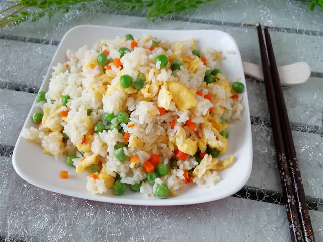 材料:隔夜米饭1碗、豌豆150克、鸡蛋2个、胡萝卜1段、油盐适量、葱1段