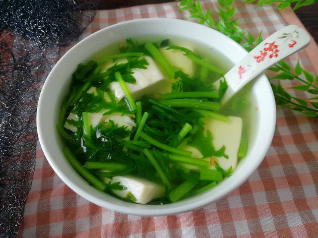 茼蒿是涮火锅时经常用到的食材,味道清香,口感脆嫩,深受大家喜爱,茼蒿能够促进食欲,消食开胃。 茼蒿具有调胃健脾效用,茼蒿含有一种挥发性的精油,以及胆碱等物质,具有降血压,补脑的作用。今天分享一道茼蒿的做法,少油、清淡可口,营养健康,茼蒿味道清香,豆腐营养鲜嫩,虾皮 增鲜提味,还能补钙,特别适合脾胃不好的人吃,这道汤做法也简单,简单几步就做好,这道汤这么好,你也做给家人吃吧,下面分享下做法: