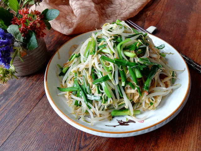 材料:绿豆芽400克、干豆腐(豆皮)2张、韭菜1把、油盐适量、姜2片、大蒜2瓣、鸡精1茶匙、