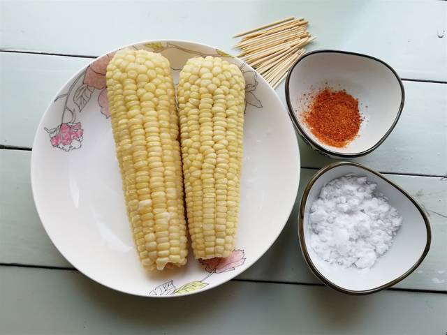 材料:玉米2穗、油适量、牙签适量、淀粉2汤匙、烧烤料适量、白糖1汤匙