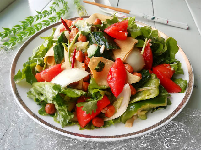 材料:黄瓜2根、西红柿2个、生菜1棵、尖椒1个、洋葱1/2个、香菜2棵、干豆腐2张、花生米1/2碗、干辣椒10个、大蒜4瓣、油盐适量、香油2汤匙、白糖2汤匙、米醋2汤匙、陈醋2汤匙、