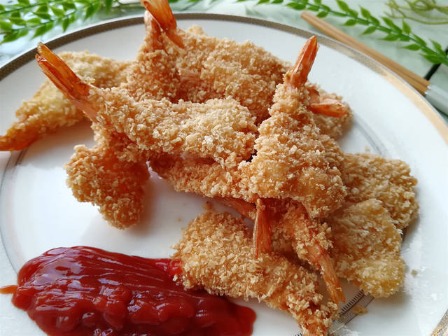 材料:大虾16只、鸡蛋1个、油盐适量、白胡椒粉1\2茶匙、面粉2汤匙、面包糠1\2袋