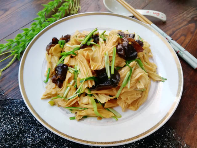 材料:腐竹(干)150克、木耳适量、蒜苗1把、油盐适量、葱1段、姜2片、鸡精1茶匙、生抽1汤匙、