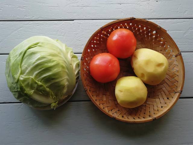 材料:包菜1/2棵、土豆2个、西红柿2个、油盐适量、葱1段、姜1片、大蒜2瓣、