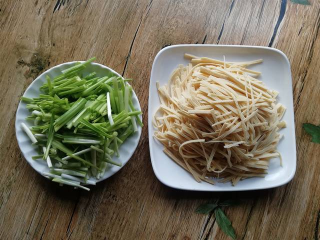材料:绿豆芽250克、豆皮2张、蒜苗1小把、油盐适量、姜2片、料酒1/2汤匙、淀粉1/2汤匙、生抽1/2汤匙、