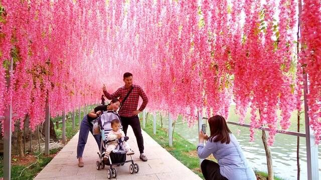 映入眼帘的是长达六十米的藤萝花海,随风轻轻飘摇,好像一片粉色的梦境。在这里和心爱的人一起漫步,一定也能收获满满的幸福。