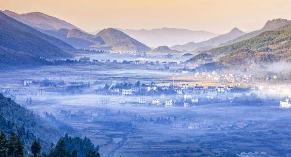 群山萧萧冬日深,一帐轻纱落凡尘。冬至时节,在重庆市丰都县武平镇坝周村,淡雾白霜犹如整幅轻纱从空中铺下,轻轻笼罩在群山环绕的农家院落、良田屋舍上,构成一幅静谧的乡村画卷。(重庆市丰都县纪委监委供 林登周 摄)