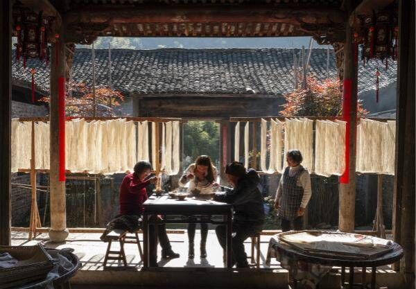 吃了冬至面,一天长一线。在初冬的日头下,杭州市富阳区湖源乡窈口村,家家户户的索面架子被抬到了屋外,一排排面线如竖琴般在微风中轻轻摇曳,院子中一人一碗热腾腾的冬至面,把冬日里的温暖都融入这一碗面中。(杭州市富阳区纪委监委供 宣世平 摄)