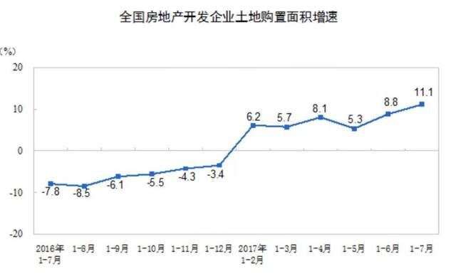 但有意思的是,作为先知先觉投资者的房企却在那时逆势而为,加码拿地,从2016年7月份-2017年7月份房企拿地的走势图,可以看出房企拿地的热情远比2016年楼市火爆时高。