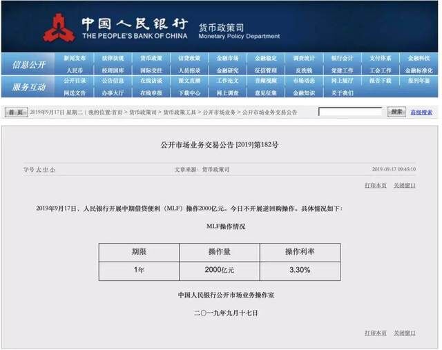 9月17日早晨,央行开展2000亿MLF操作,期限是1年,利率是3.3%,无逆回购操作。