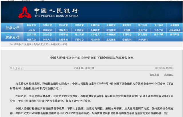 9月6日下午5点22分,央行宣布将于2019年9月16日全面下调金融机构存款准备金率0.5个百分点。