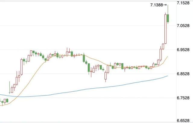 周一人民币兑美元汇率一举击穿“7”整数关口,当天离岸人民币高低点之间振幅达1303点,让人惊叹。周二早盘,离岸人民币延续周一跌势,离岸人民币兑美元汇率最低到7.1388,到了早晨9点,离岸人民币突然急速拉升,高低点之间振幅超800点。