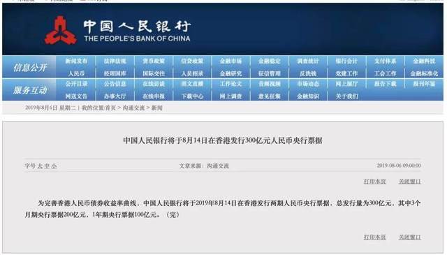 为完善香港人民币债券收益率曲线,中国人民银行将于2019年8月14日在香港发行两期人民币央行票据,总发行量为300亿元,其中3个月期央行票据200亿元,1年期央行票据100亿元。