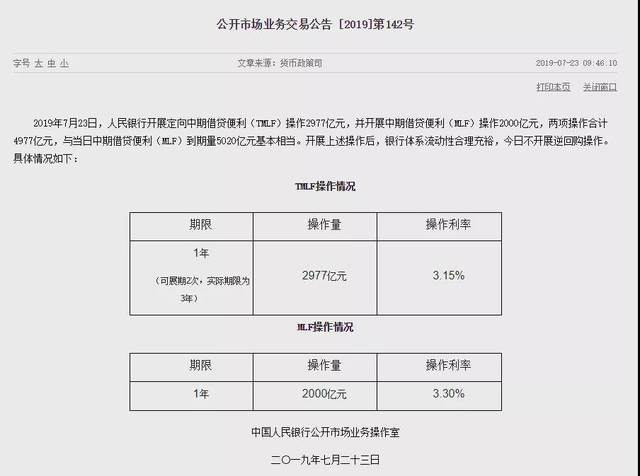7月23日,央行开展了定向中期借贷便利(TMLF)操作2977亿元,并开展中期借贷便利(MLF)操作2000亿元,操作总量与当日的MLF到期量相当。